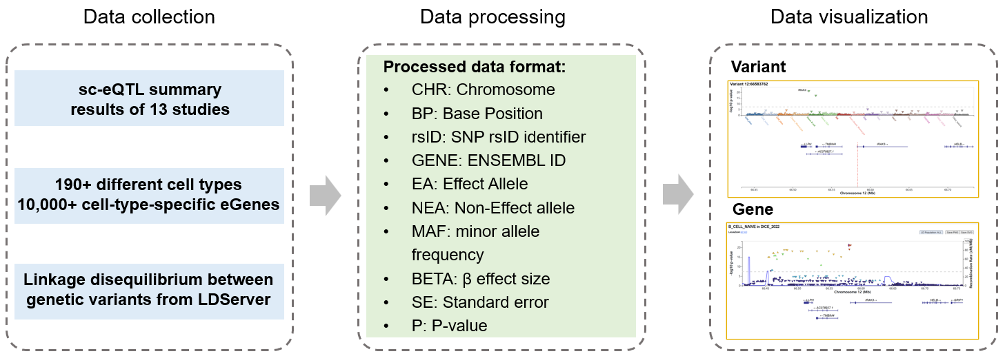 Single cell approaches have already revealed that stem cell cultures contain multiple cell types that have unique transcriptional profiles. Single-cell eQTL Hub aims to comprehensively provide single cell eQTLs in different cell types. It provides a number of tools aimed at functional interpretation. The single-cell eQTL Hub includes 15 studies with 3,358 donors providing nearly 10 million cells of more than 240 different types. More than 10,000 eGenes were identified by eQTL analysis.